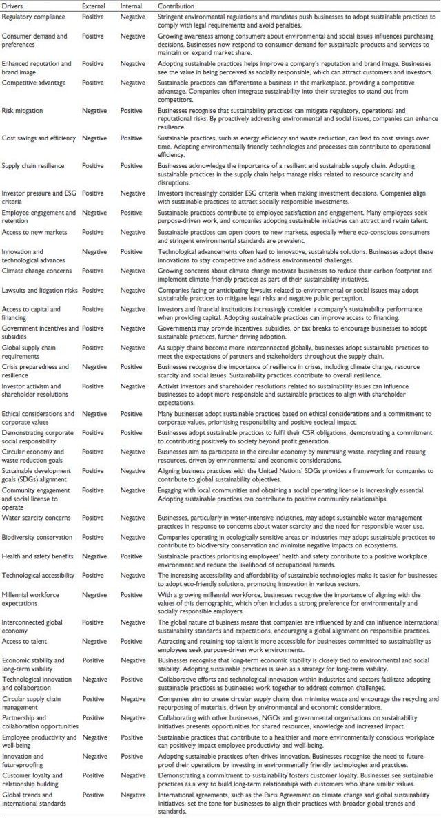 Businesses adopt sustainable practices for various reasons, driven by internal and external factors. Key factors contributing to adopting sustainable practices are depicted in Table 2.
