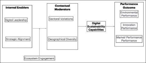 The ultimate expression of capability effectiveness in this framework is this set of outcomes. They are multidimensional and encompass both the tangible and intangible benefits derived from the development and application of DSCs. Environmental performance refers to reductions in emissions, waste and resource consumption, as well as enhanced compliance with environmental regulations. Operational performance captures gains in process efficiency, cost savings and error reduction. Innovation performance reflects the firm’s ability to generate new green products, services or business models, while market/customer performance relates to enhanced brand reputation, customer loyalty and competitive positioning. It structures outcomes across these four domains. The framework thus transcends narrow financial metrics to provide a comprehensive view of SME performance in a sustainability-driven digital economy. The bridge between DSCs and performance outcomes underscores the strategic importance of digital sustainability in building resilience and long-term value in emerging market enterprises. The interrelationships between internal enablers, ecosystem engagement, contextual moderators, and firm performance outcomes are summarised in the conceptual framework (Figure 1).