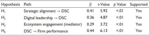 Ecosystem engagement significantly mediated the effects of strategic alignment and leadership on DSC development (H3b and H3c supported), validating the importance of external collaboration. SMEs that co-designed solutions with suppliers, participated in sustainability networks or engaged with digital service providers were more effective in translating internal intent into actionable capabilities.