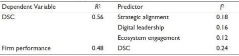 The model demonstrated substantial explanatory power, with DSCs accounting for 56% of variance and firm performance for 48%, as shown in the R2 and effect sizes (Table 5).