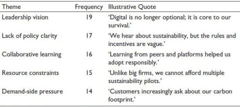 In several case studies, SMEs led by second-generation entrepreneurs or digital-native managers showed greater sophistication in adopting green ERP systems, digital traceability tools and customer-facing sustainability reporting platforms. This affirms the view that leadership vision and digital literacy are critical, not just access to capital or infrastructure.
