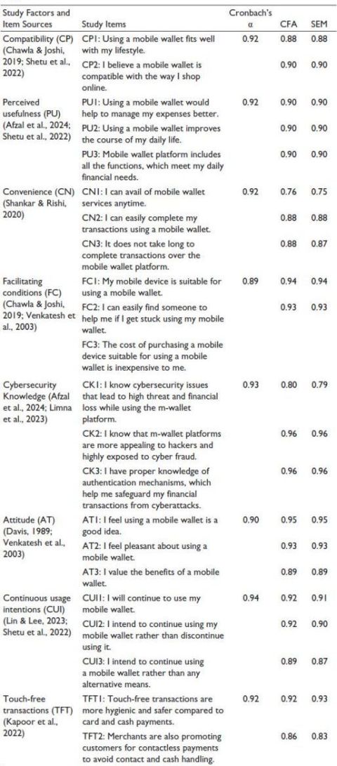 The experts and scholars in the related subject were consulted regarding the study questionnaire and items, and as a result, some minor modifications were implemented. To assess the level of complexity and participants’ comprehension of the items in the questionnaire, a pilot survey was conducted with 25 existing m-wallet users. The preliminary survey findings indicated that the respondents perceived the survey items as comprehensible, confirming their appropriateness for the intended objective. Furthermore, it was discovered that slight modifications in the wording of specific items were required based on the advice supplied by experts and participants in the preliminary survey. Consequently, these necessary modifications were implemented before disseminating the questionnaire. Moreover, the data collected in the last stage and throughout the pilot survey stage were not combined to prevent potential bias. Additionally, it was found that Cronbach’s αduring the pilot survey phase exceeded 0.70, indicating the validity of the questionnaire and its items.
