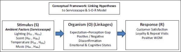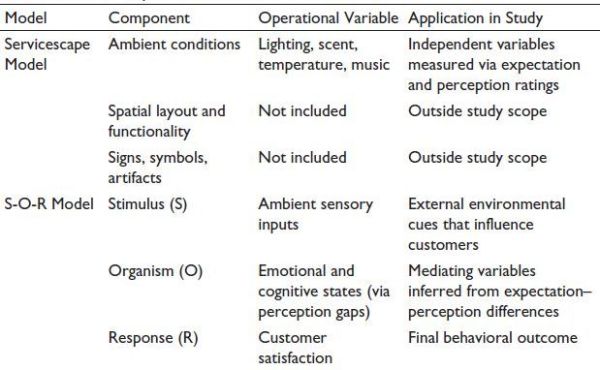 The integrated theoretical structure of this research is summarized in Table 1. Ambient conditions (lighting, scent, temperature, and music) are analyzed as stimuli in the S-O-R framework and as core environmental dimensions within the servicescape model. Customer emotions and perceptions, inferred through the difference between expectations and perceptions, serve as the organismic element. Finally, satisfaction is treated as the behavioral response demonstrating the combined influence of physical environment and psychological processing. This framework not only validates the relevance of sensory design in service environments but also provides a quantitative pathway for assessing its real-world impact.