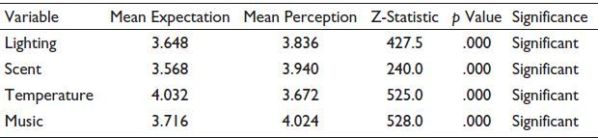 Based on Table 4, the Wilcoxon signed-rank analysis reveals a nuanced interplay between customer expectations and sensory experiences in Indian urban restaurants, with divergent patterns emerging across ambient factors.