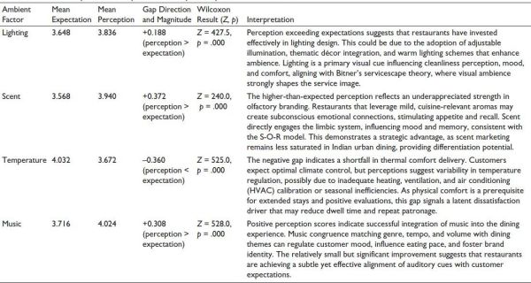 The sensory environment of a restaurant, commonly referred to as the servicescape, plays a critical role in shaping customer satisfaction. In the context of India’s urban hospitality sector, where competition is high and experiential quality is a key differentiator, understanding the gap between customer expectations and their actual perceptions becomes essential. To address this, we employed the Wilcoxon signed-rank test, a nonparametric statistical method ideal for comparing paired samples from the same subjects (i.e., each respondent’s expectation vs perception). This analysis aims to evaluate the statistical significance of gaps across four ambient dimensions: lighting, scent, temperature, and music.